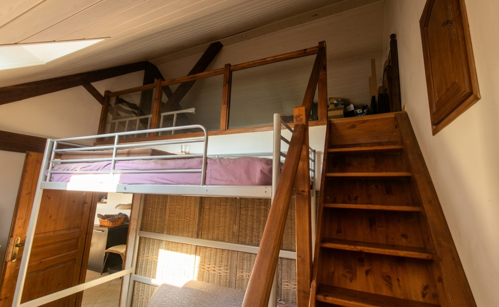 Il se compose d'une entrée avec dégagement, une cuisine ouverte sur séjour pour 24m² donnant accès à une mezzanine, une salle de bains, un WC, deux chambres dont une avec coin mezzanine.