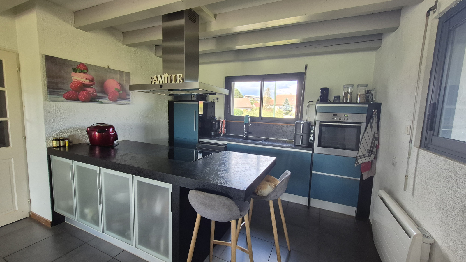 MAICHE. Située dans un quartier calme, maison d'architecte d'environ 130m² habitables, composée d'un hall d'entrée avec poêle à granulés et placards, une grande pièce de vie avec cuisine aménagée et équipée exposée plein Sud avec accès à la véranda et au jardin, une lingerie, un WC, un garage +33m² isolé avec accès à la cave enterrée.