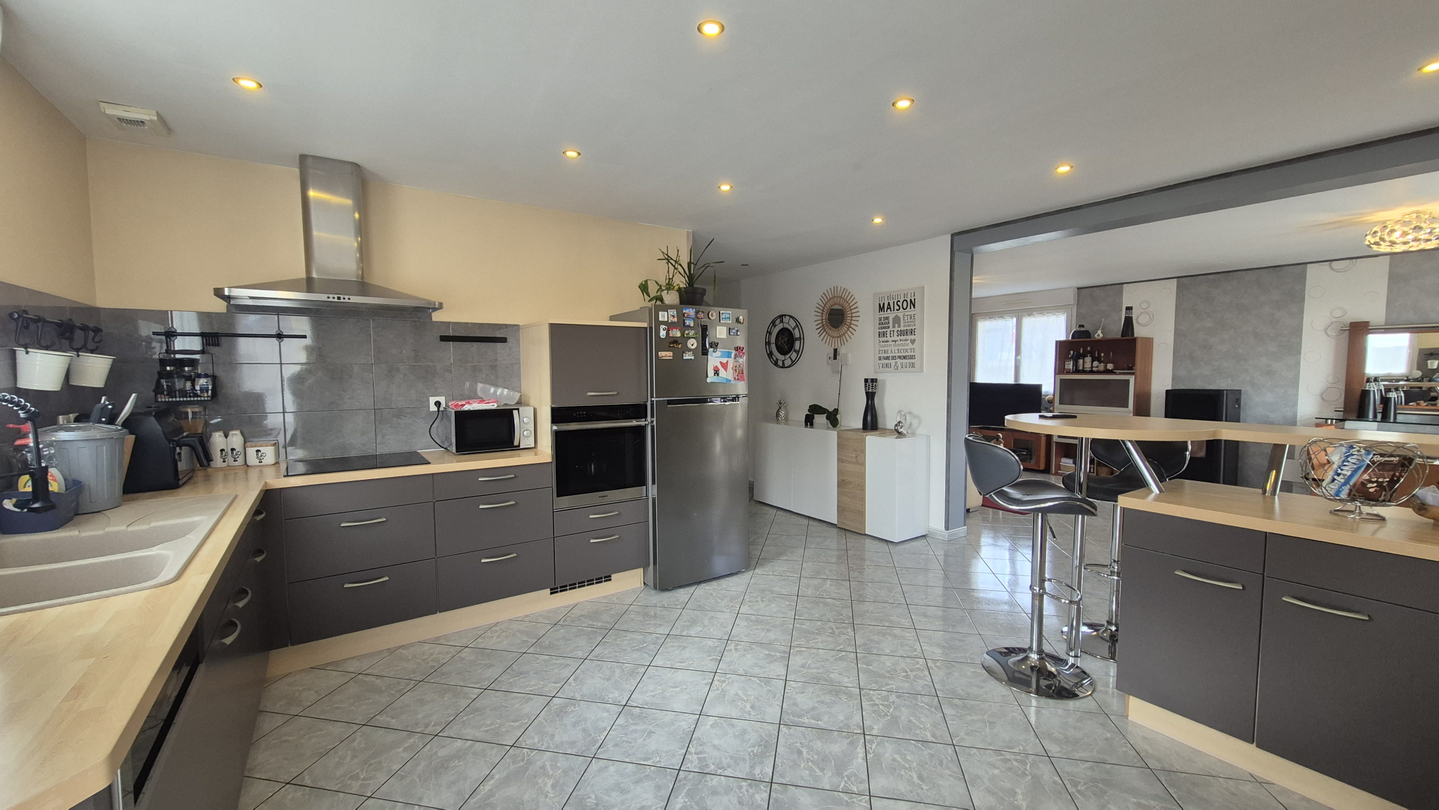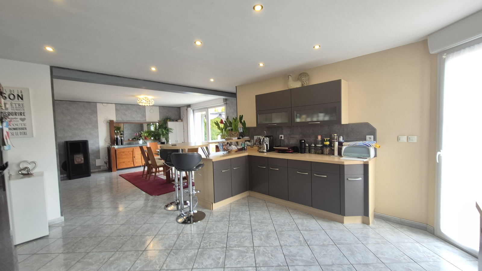 Dès l'entrée, vous serez séduit par la luminosité et les volumes de cette maison de plus de 130 m². La cuisine ouverte sur le séjour, exposée plein sud, offre un espace de vie convivial et chaleureux avec son poêle à granulés, idéal pour les moments en famille ou entre amis. Vous pourrez également profiter d'un accès direct à la terrasse pour les beaux jours.